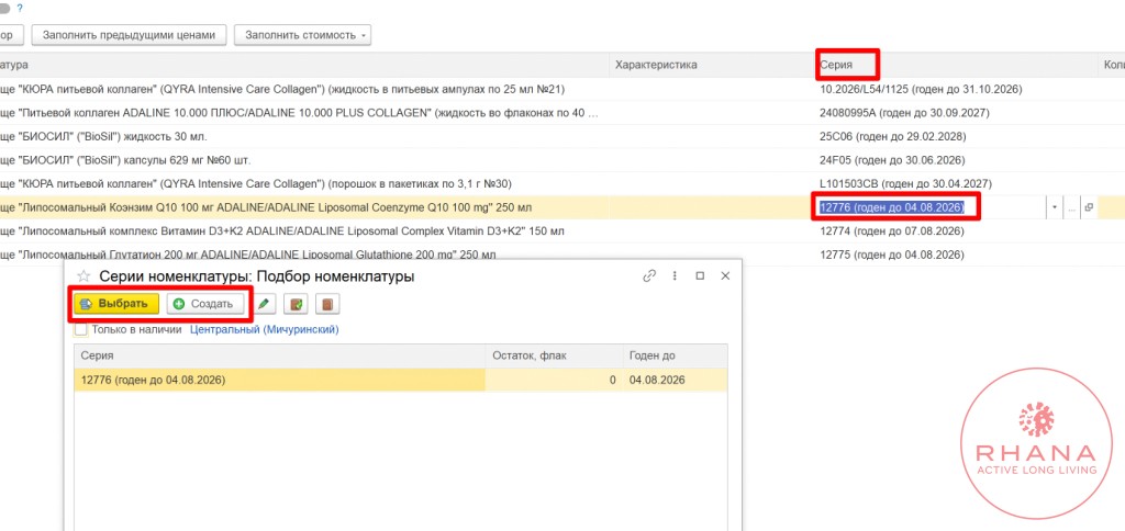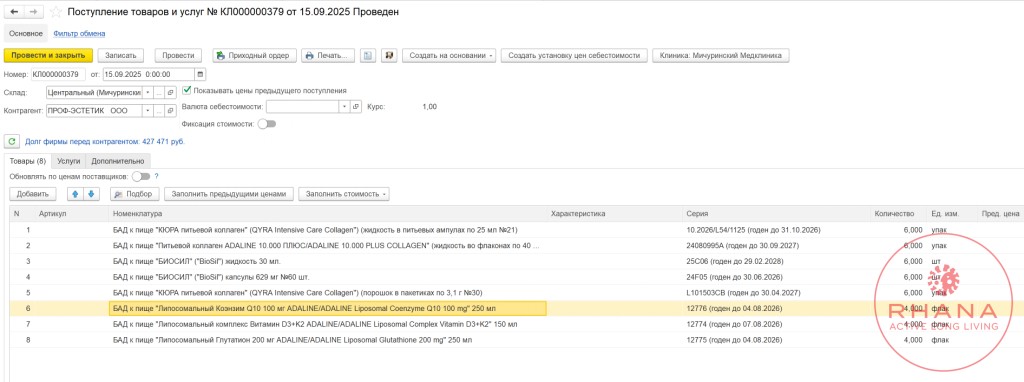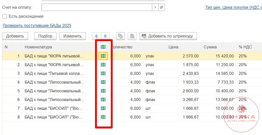 Коды маркировки в документе заполняются через операция «Проверить поступившие БАДы 2025». При открытой форме со списком проверки — можно сканировать Data Matrix коды, которые автоматически будут проверяться в Честном знаке.