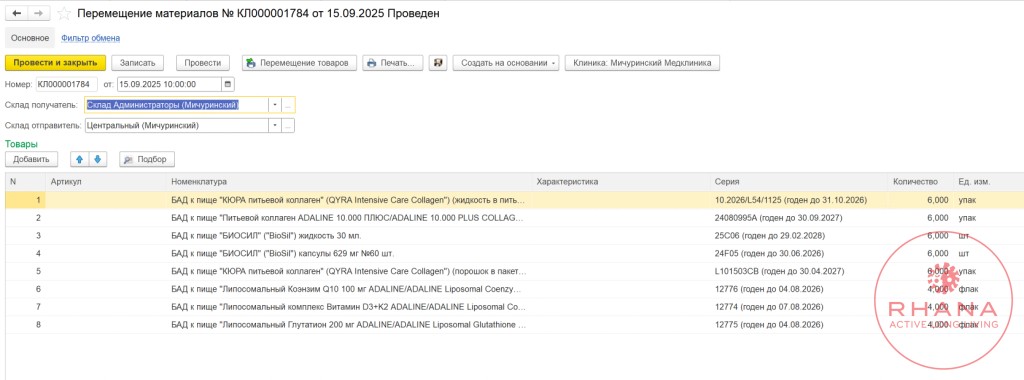 - Оформить «Перемещение товаров» на склад администраторов