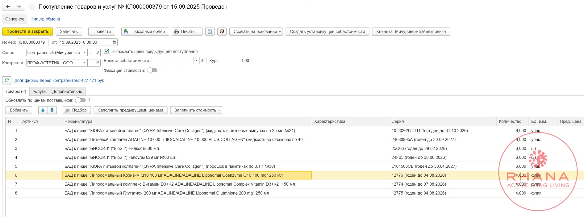 - Оформить «Поступление товара» на центральный склад