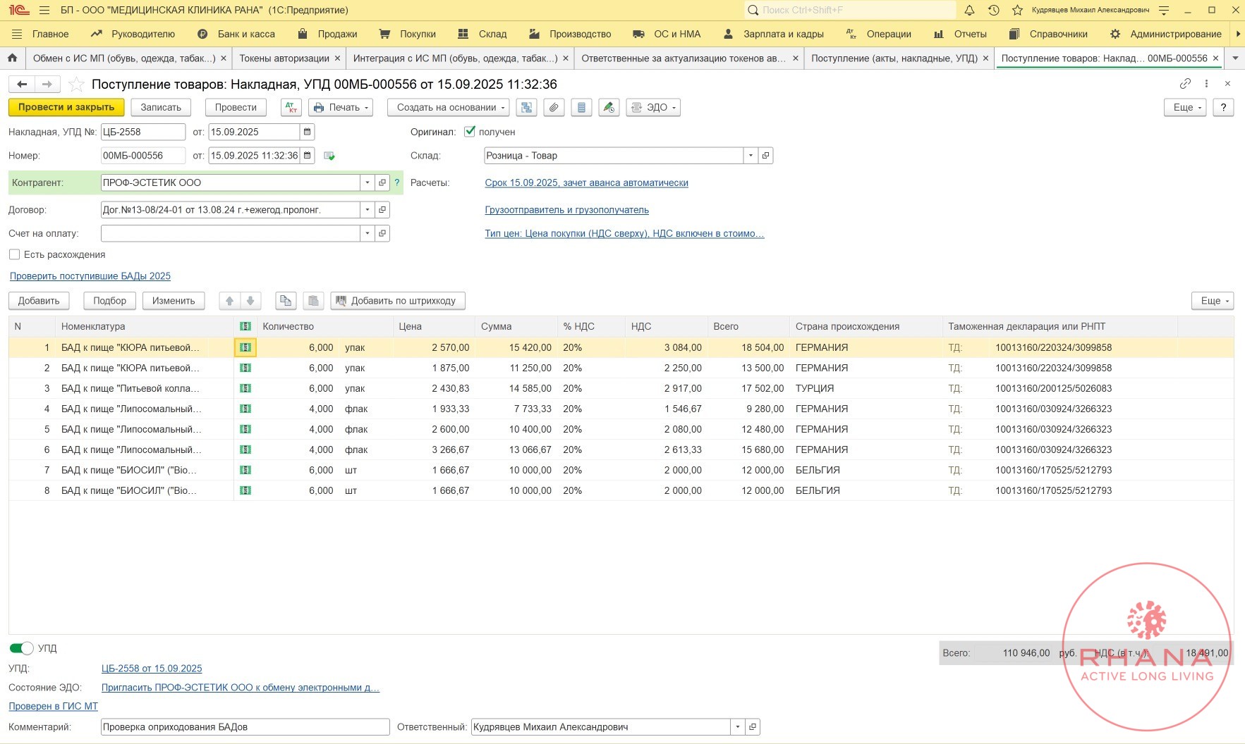 Коды маркировки в документе заполняются через операция «Проверить поступившие БАДы 2025». При открытой форме со списком проверки — можно сканировать Data Matrix коды, которые автоматически будут проверяться в Честном знаке.